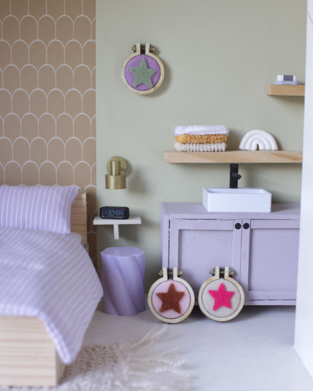 Kies je favoriete kleuren voor de handgemaakte ster hanger van vilt, zodat deze helemaal past bij jouw poppenhuis interieur en je hebt écht iets unieks aan de muur hangen. Of plaats hem op een kastje of wandplankje, dat kan natuurlijk ook!